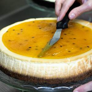 Base de crumble crujiente, crema de queso suave, cubierto con una capa de jugosa y trópica mermelada de maracuyá. Imperdible