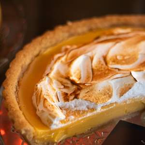 Variación de la clásica Lemon Pie con base crujiente de galleta, rellena de crema de maracuyá fresca y cubierta con un suave merengue.