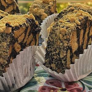 Base de chocolate y bizcocho con crocante de galleta maria. Se hace en rulo y se corta como un embutido. De ahí viene su nombre